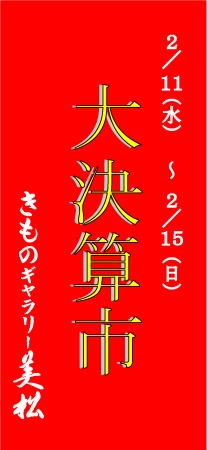 ようこそ!美松HPへ。 さて、今年最初のスタッフ日誌の更新となりました。 まずは 『 2026決算市 』 のご案内から。 毎年、この時期、弊社ではこの『大決算市』を開催させていただいております。 決算市の内容を分かりやすく説明させていただくと、商品に付いている札の色で、値引き率が変わります。 赤札は半額、黄札は3割引、緑札は2割引になり、良いものをいつもよりお求めやすくさせていただく5日間です。 皆様のきもの生活に素敵な商品をお得に見つけていたければと思います。 皆様のご来店をお待ちしております。 『2026大決算市』 期間 : 令和8年2月11(水)〜15(日) 時間 : 10:00〜18:00 所:きものギャラリー美松 富田林市津々山台3−1−22 電話 : 0721−28−8795 ご来店の際には是非ご予約くださいませ。 |